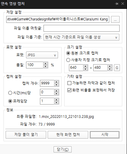 동영상의 프레임을 추출한다. 팟 플레이어로 가능하다. 다른 블로그에서 VLC 플레이어로 하라길래... 뭘 잘못한건지 해봤더니 영 시원치 않았다. 팟 플레이어로는 아주 만족스러운 결과가 나왔다. 방법은 아래와 같다. (i) 영상을 시작한 후 뽑아내고 싶은 지점으로 이동한다. (ii) Ctrl + G를 누르면 아래와 같은 창이 뜬다. (영상을 정지한 상태에서 D나 F를 눌러보면 프레임 단위로 이동도 가능하다.) (iii) 저장 경로를 설정하고, 캡처 개수를 추출하고 싶은 정도만큼 설정해준다. (본인은 필요한 부분을 모두 자세히 보고 싶어서 넉넉하게 9999 입력했다.) (iv) 시작 버튼을 누르면 모든 프레임이 추출 준비 완료가 된다. (v) 영상을 재생하면, 모든 프레임이 당신이 설정한 경로에 저장된다. ..